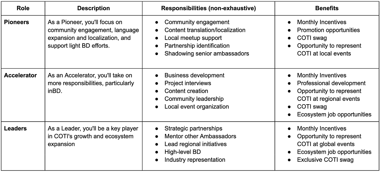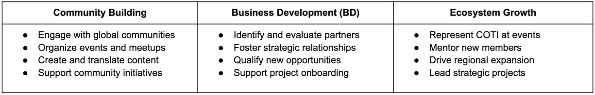 The Ambassador program centers on three key pillars that drive COTI’s ecosystem growth: